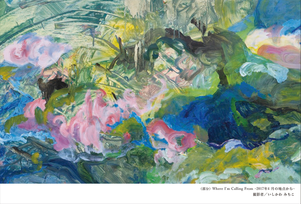 本展では、私が様々な地点で描いた作品を「旅の向こうに」というテーマで展示いたします。モチーフにしたのは私の前に実際にあった山や雲、建物や植栽です。絵の具が重なるにつれ、どれもそれそのものとは離れた色の風景になり、描き終えたとき自分が遠くに来た気がしました。
